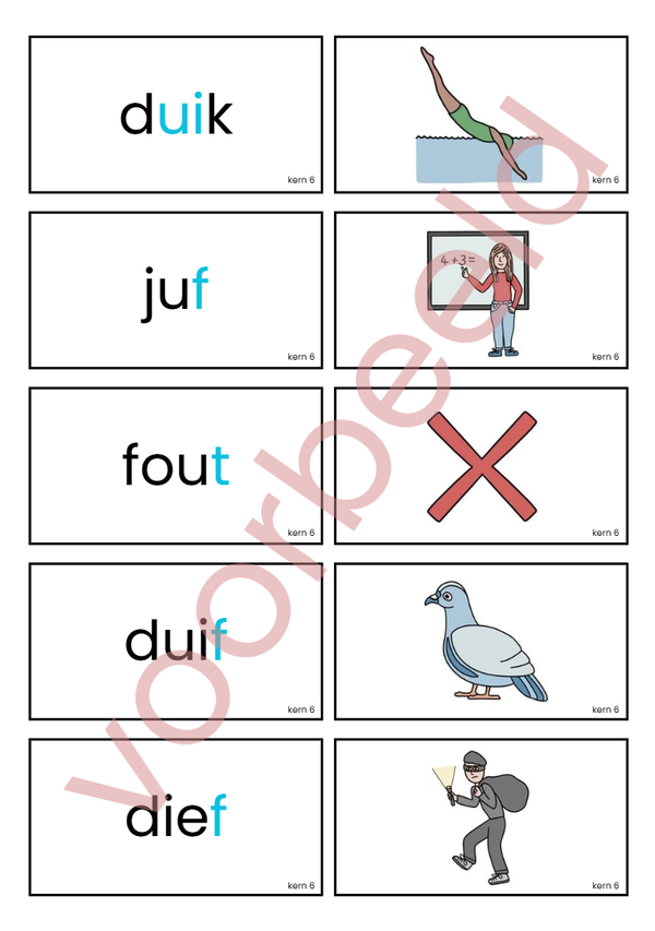 Met deze woordkaartjes en het match spel oefen je de categorieën die in kern 6 van Veilig Leren Lezen aan bod komen.